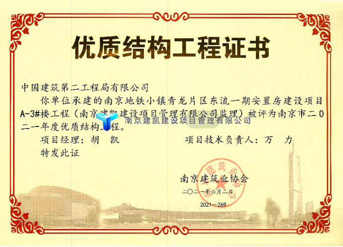 2021年榮獲優(yōu)質(zhì)結構項目—南京地鐵小鎮青龍片區東流一期安置房建設項目(A3#樓、A6#樓)