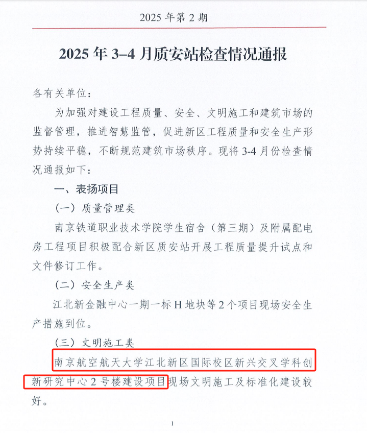 南京航空航天大學(xué)江北新區國際校區新興交叉學(xué)科創(chuàng )新研究中心2#樓項目榮獲區通報表?yè)P